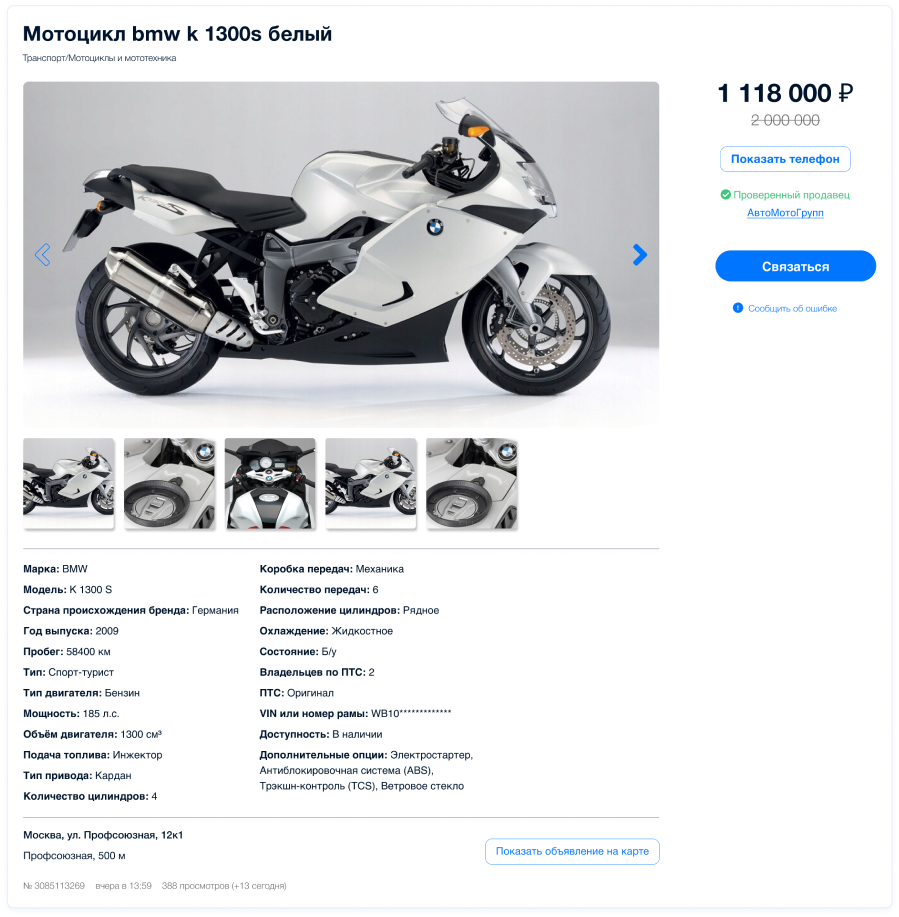 Подробная карточка товара включает в себя полный набор заполненных полей при размещении товара, услуги, имущества. Отображаются фото и видео.