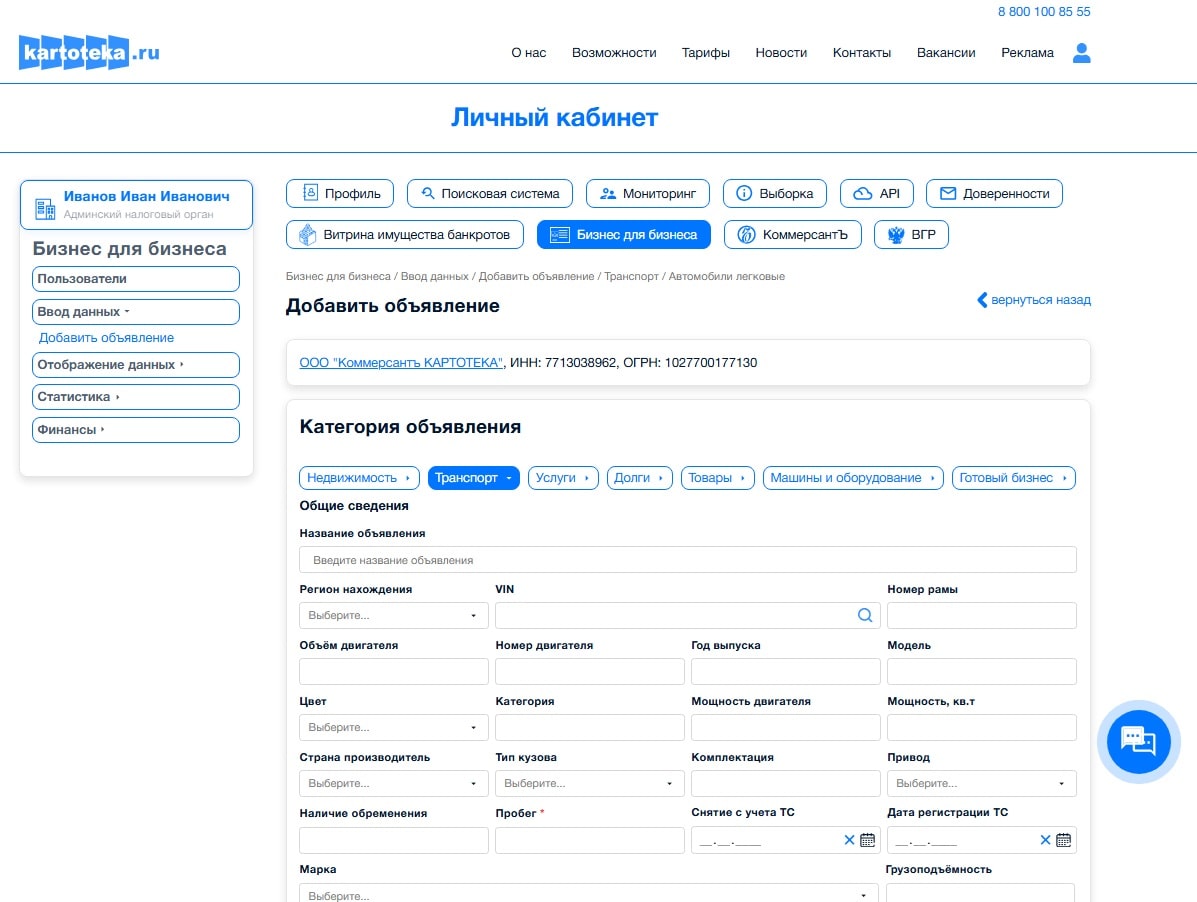 Войдя в личный кабинет, выберите раздел «Бизнес для бизнеса» и определитесь с «Категорией» размещаемого товара, имущества или услуги. Все категории имеют свои собственные поля ввода. После заполнения доступных полей объявление автоматически разместится и будет представлено в результатах поиска и во вкладке «Партнерам» на карточке компании.