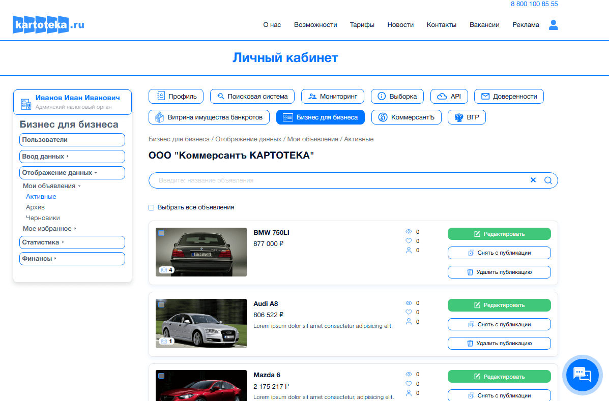 Разместив объявления, все карточки объявлений доступны в личном кабинете в разделе «Мои объявления». Из данного раздела пользователь может