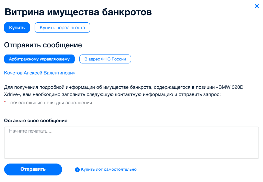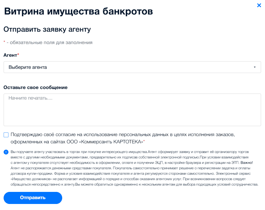 В случае заинтересованности в приобретении имущества пользователю предоставляется возможность воспользоваться услугами агента. Данная услуга включает полный цикл сопровождения сделки, начиная с участия в торгах и заканчивая оформлением права собственности. Для инициирования процедуры посредничества пользователю необходимо нажать на кнопку "Помощь агента", после чего откроется форма для выбора организации, специализирующейся на подобных операциях.