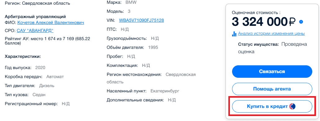 Также у Вас есть возможность приобрести интересующее имущество в кредит кликнув на кнопку «Купить в кредит».