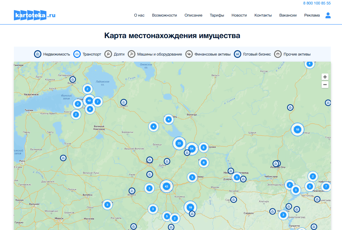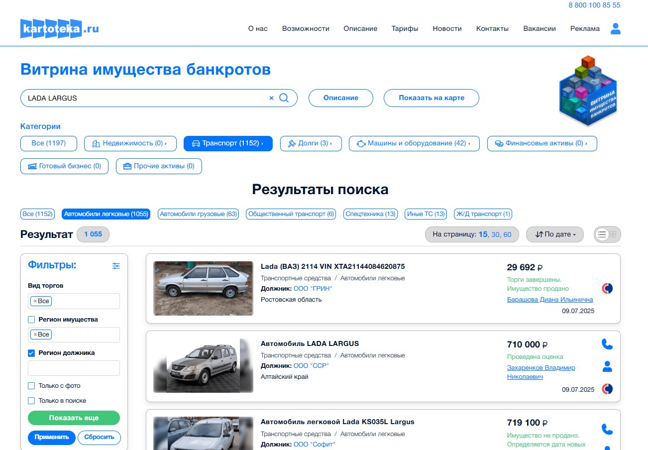 На основной странице витрины имущества банкротов отображены объявления в порядке добавления от новых к старым. Найти интересующий товар можно с помощью поисковой строки или с помощью применения вертикальных и горизонтальных фильтров (по категориям, регионам, цене, датам, статусам). Рядом с поисковой строкой расположилась кнопка «Показать на карте», этот функционал поможет вам визуально представить точкой на карте местоположения объектов.